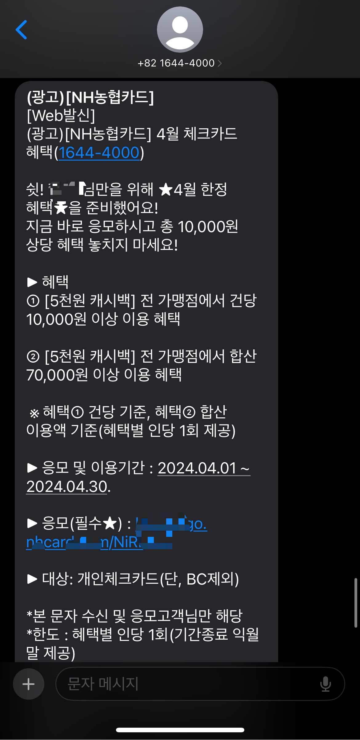 문자 수신 고객에 해당하며, 문자에 제공된 링크로 들어가서 응모를 해야 한다. 혜택별 인당 1회이며, 캐시백은 기간종료 익월말에 제공된다.