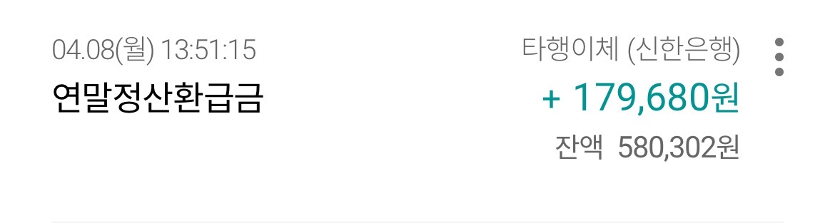 드디어 연말정산 환급 금액이 들어왔습니다. 중소기업 20대 사회초년생으로서 연말정산 환급금이 얼마정도 들어오는지 기록하여 공유합니다.