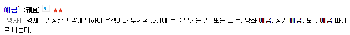 2. 정기 예금 : 일정 금액을 일정 기간 동안 금융 기관에 맡기고 정한 기한 안에는 찾지 아니하겠다는 약속으로 하는 예금. 이자는 일정 기일이 되면 원금과 함께 지불하지만 예금자가 요청하면 매월 지불한다.