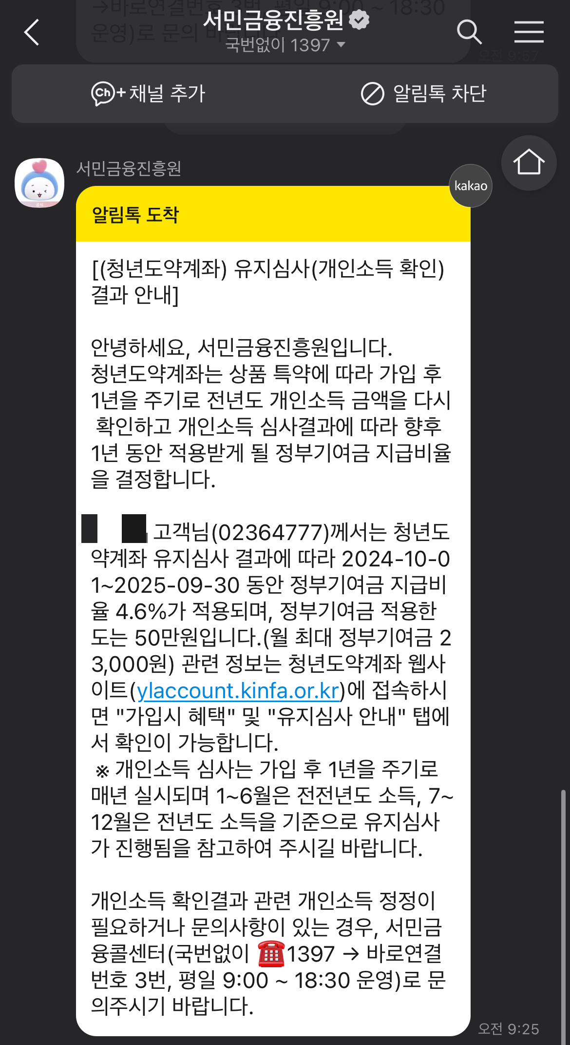 청년도약계좌 적금을 들고 있다. 가입한 지 1년이 되어서 유지심사를 받아야 한다고 안내 톡이 왔고, 오늘 유지심사가 완료되었다고 다시 안내톡이 왔다.