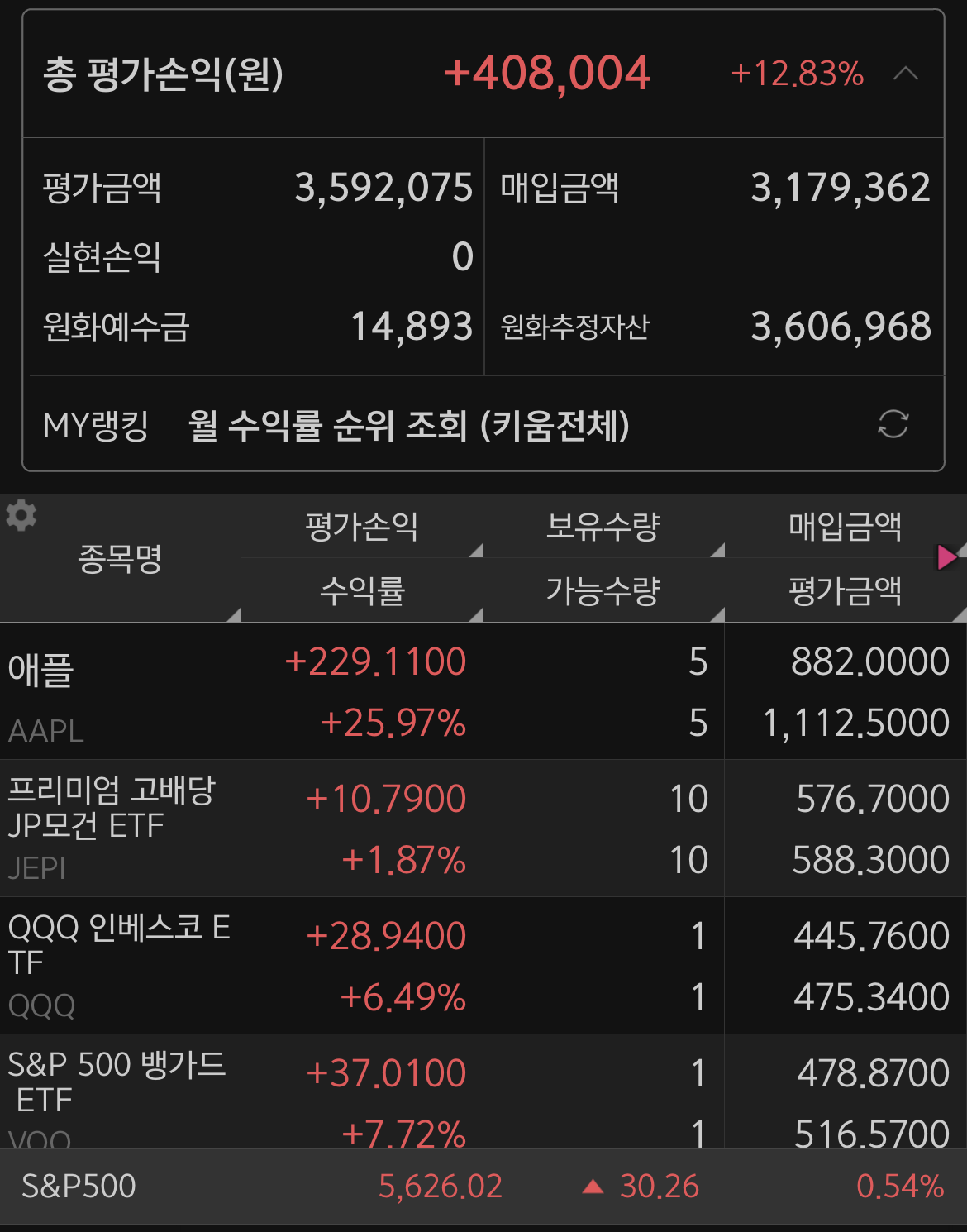 해외주식을 다시 시작하였습니다. 이전에 구매해두었던 주식을 사정상 팔았었는데, 다시 구매했습니다.해외주식 보유 현황현재 해외주식 보유 현황입니다. 애플 5주, QQQ 1주, VOO 1주를 샀습니다.