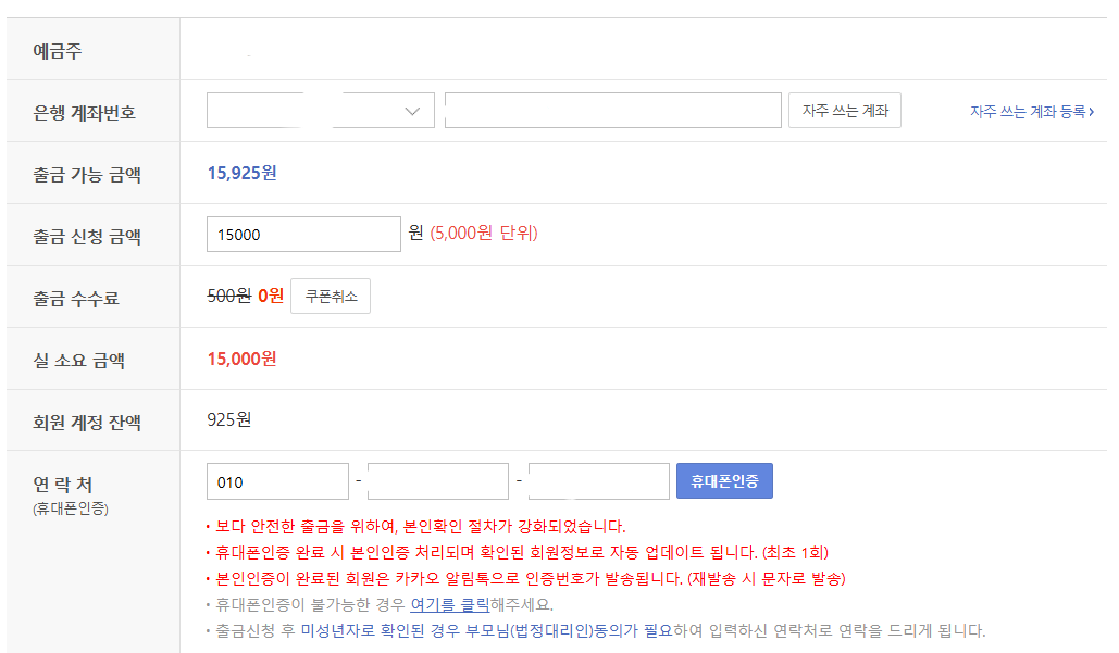 오천원 단위로 출금 신청을 할 수 있고, 출금 수수료가 있는데 이벤트로 출금수수료 면제 쿠폰을 받아서 신청을 하면 됩니다. (출석체크 이벤트 주로 활용. 한 달에 10일 출석하면 받을 수 있음)
