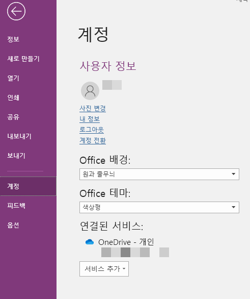 끝에 '연결된 서비스'에는 개인의 OneDrive가 떠서 놀랐다.