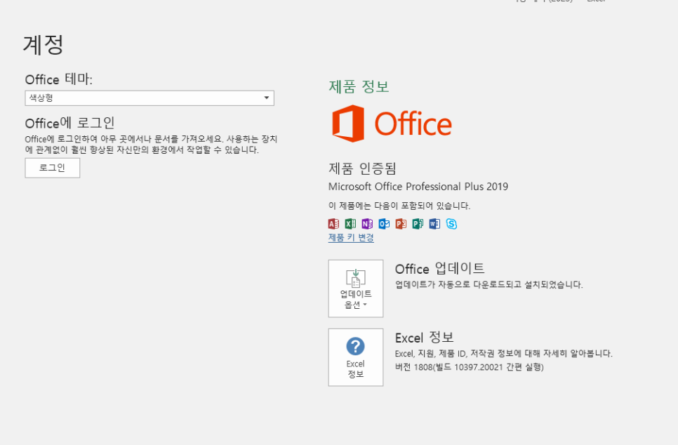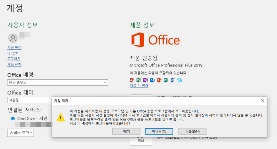 Microsoft Office Professional Plus 2019 정품인증된 것이라서 로그아웃해도 문제가 되지 않는다는 것이다!