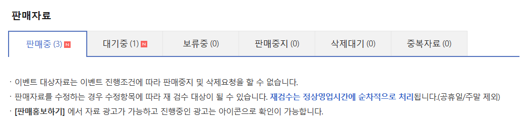 ▶ 마이페이지 > 내 자료 > 판매자료 로 들어가면 판매중/대기중/보류중/판매중지/삭제대기/중복자료를 볼 수 있습니다.