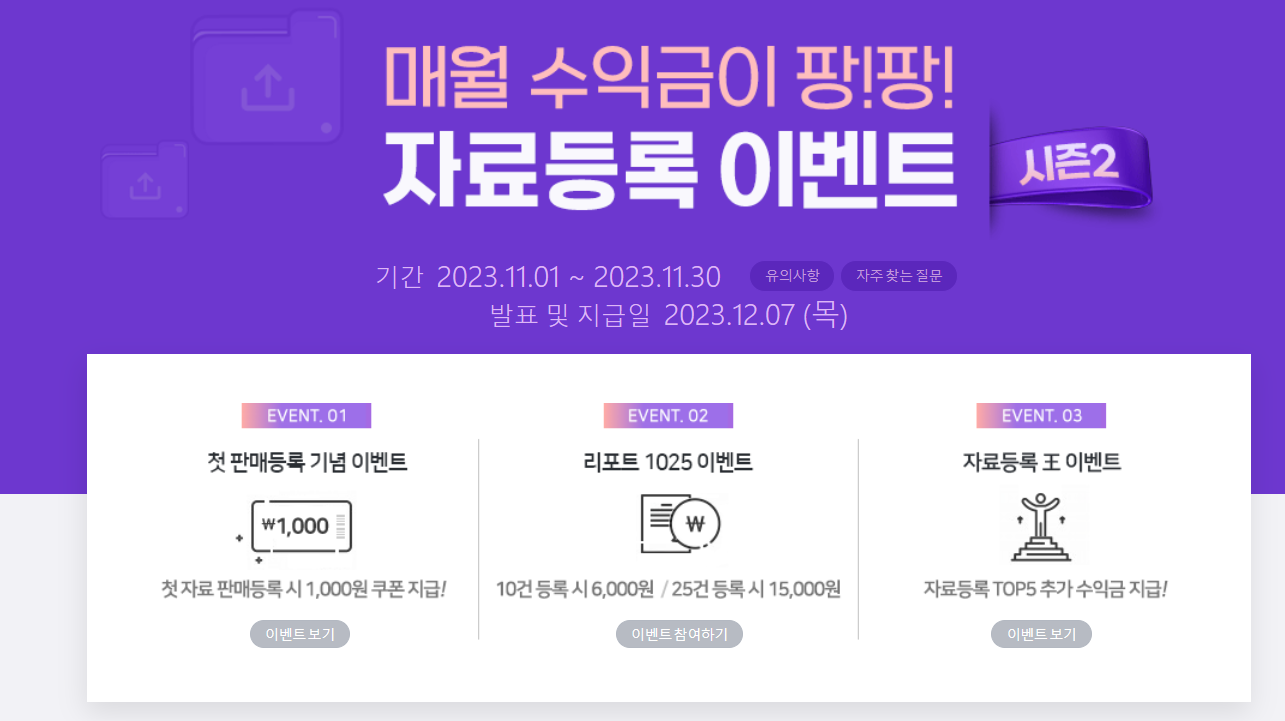 매월 팡!팡! 터지는 자료등록 이벤트 자료등록 이벤트 유의사항 닫기 유의사항 1. 자료기준 ㆍ이벤트 기간 내에 업로드 된 자료 중 검수를 통과하여 판매가 시작 된 자료 (무료자료 제외) ㆍ리포
