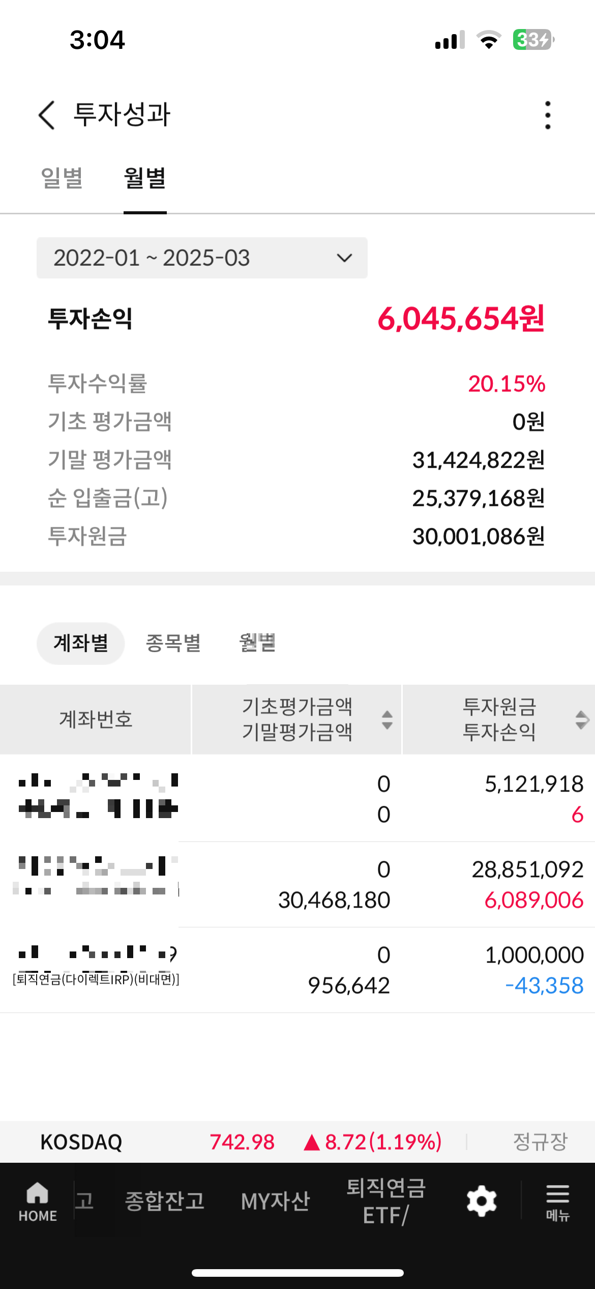 3년차에 플러스 천만원, 마지막에 더 해서 총 약 3천만원정도 3년간 모았고, 수익금 및 배당금(매우 소액임) 있어서 납입금, 투자원금 총 3천만원에 기말 평가금액 3천1백만으로 마무리. 중도인출 약 5백만원 정도는 했음. (익절하고 사용)