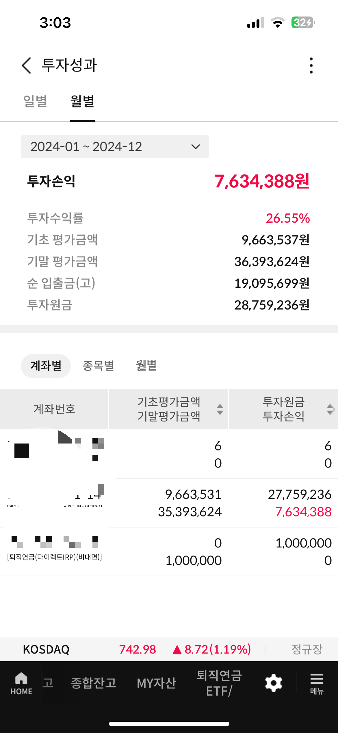 투자원금 2천7백만원정도, 수익 7백6십만원정도.