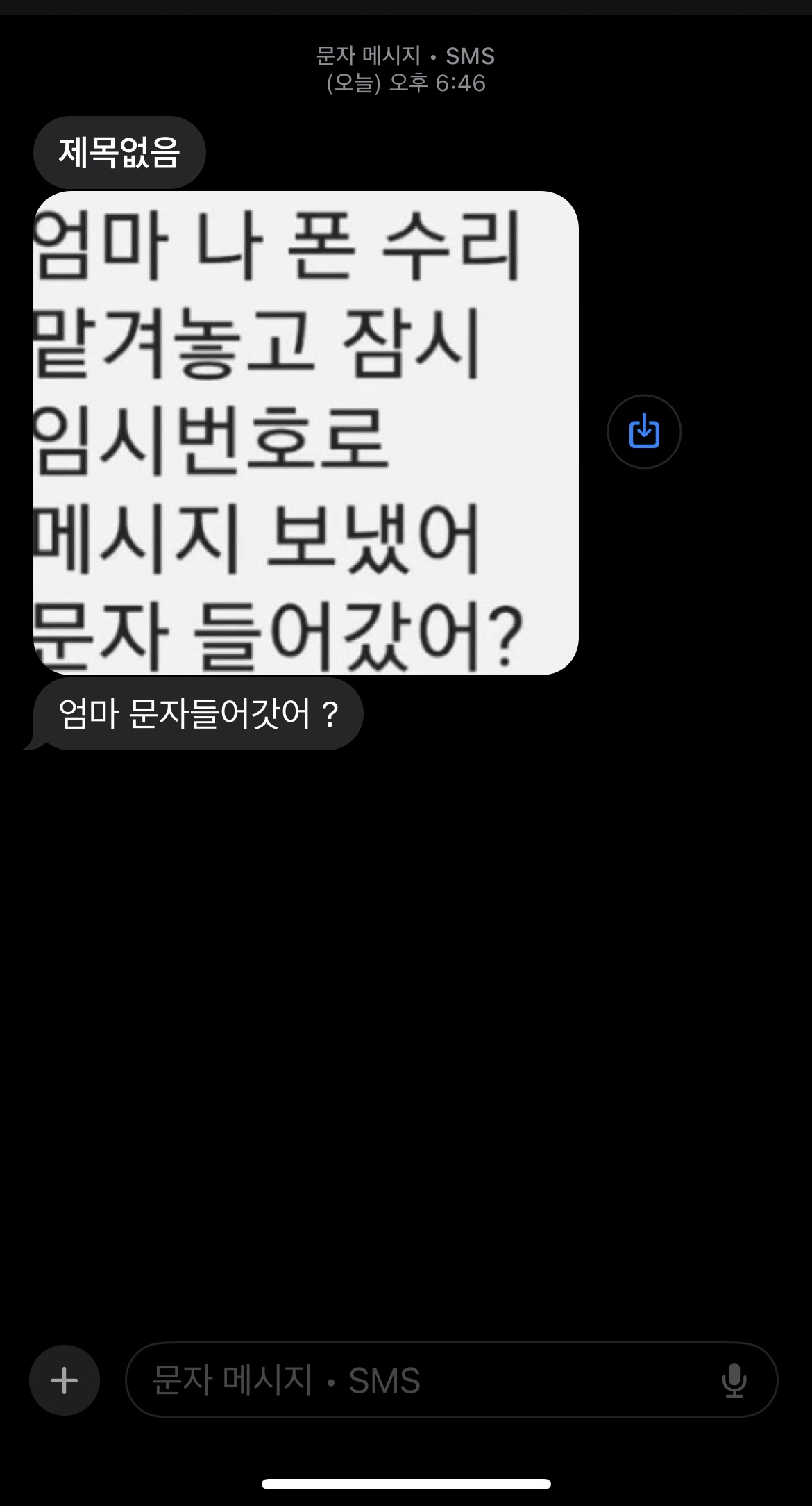 엄마 나 폰 수리 맡겨놓고 잠시 임시번호로 메시지 보냈어 문자 들어갔어?