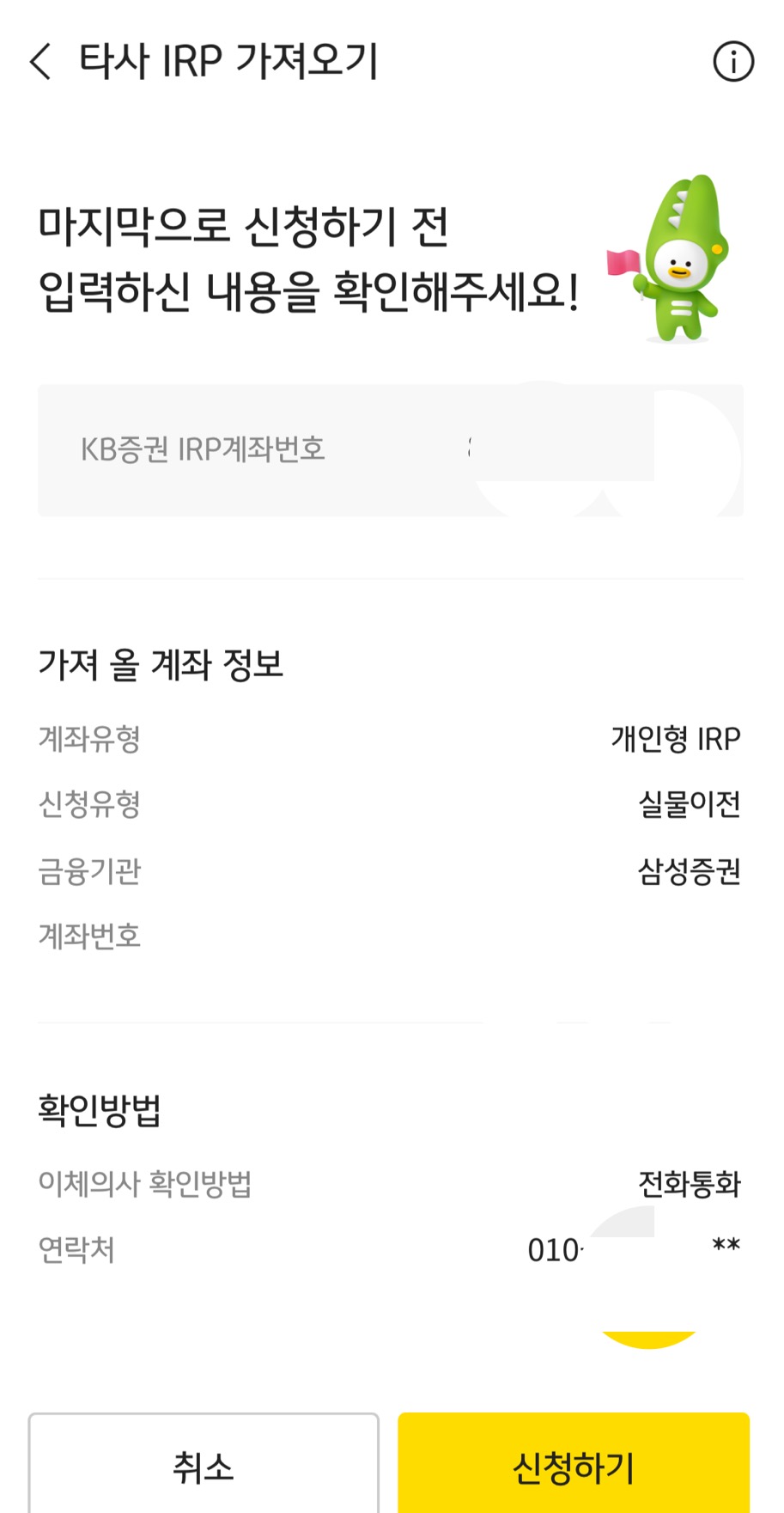 삼성 증권에서 KB증권으로 IRP 이전 신청을 하고 옮기기로 했다.