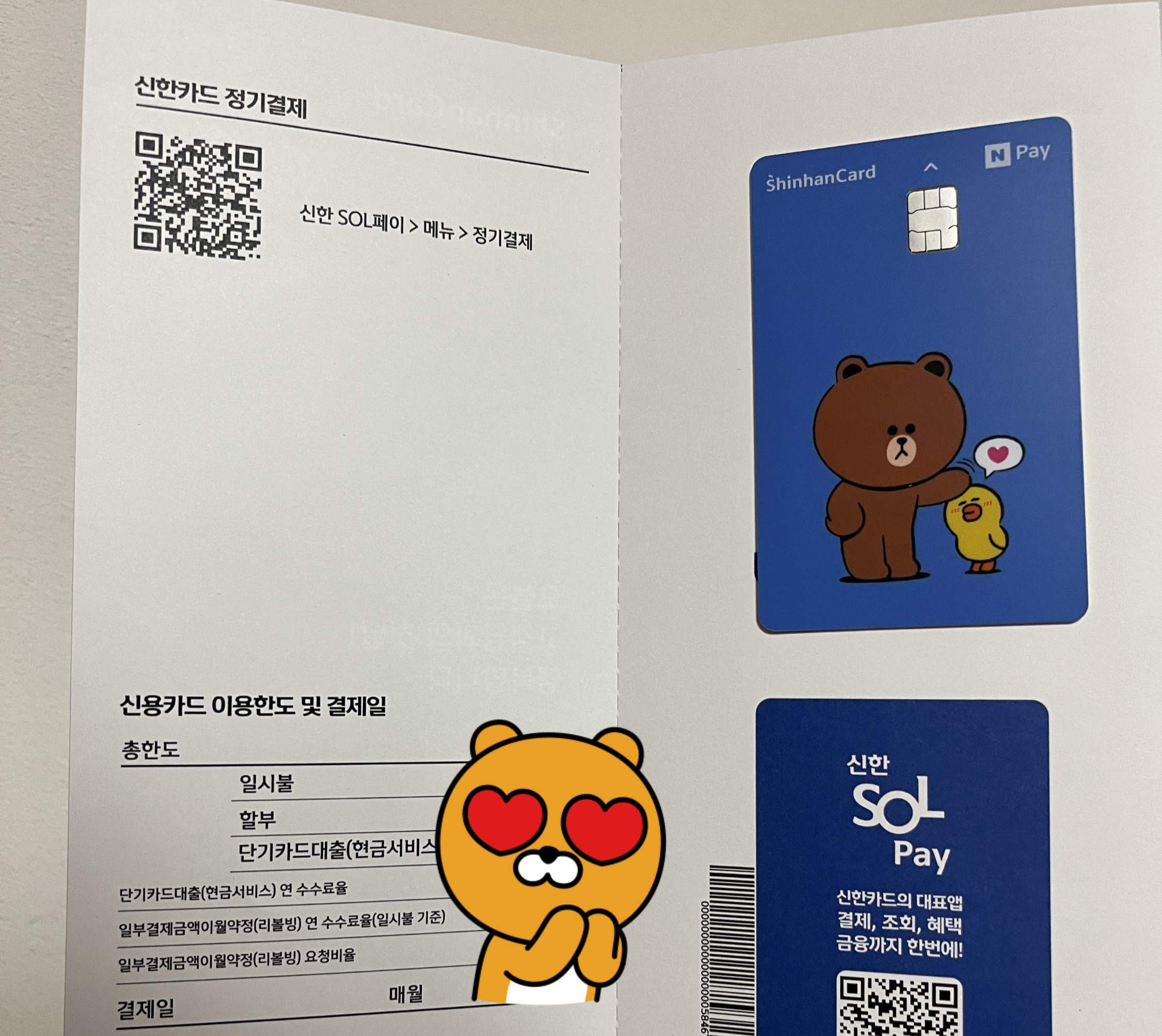 위와 같이 이용한도와 결제일 등의 정보가 담긴 종이에 카드가 붙어서 배송됩니다. 실물은 깔끔하고 귀여워요. 카드 번호같은 정보가 뒷면에 다 있고 앞면은 깔끔하게 캐릭터만 있습니다.